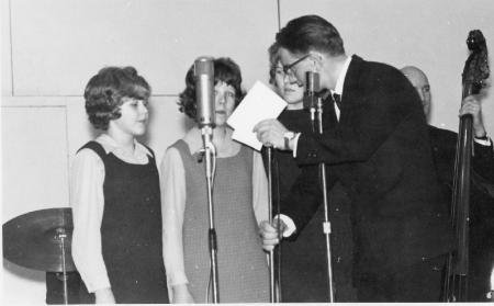 Systrarna Pirjo, Eija och Marja-Riitta Eriksson och Paul Lindell vid Pargas Talangjaktsuttagningrna år 1968 (?)