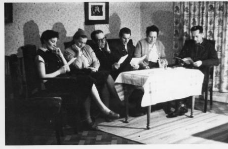 De ungas vänner i Hitis repeterar teaterpjäs. På bild: Ekebom, Stina Enberg, Louis Lundell, Holger Enberg, Edna (efternamn oidentifierat), Sven Örnell. Årtal okänt.